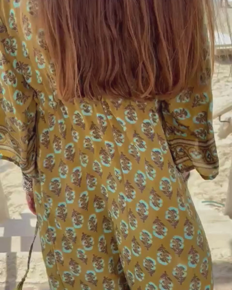 קימונו ארוך + שרוך - קימונו חרדל נגיעות זהב