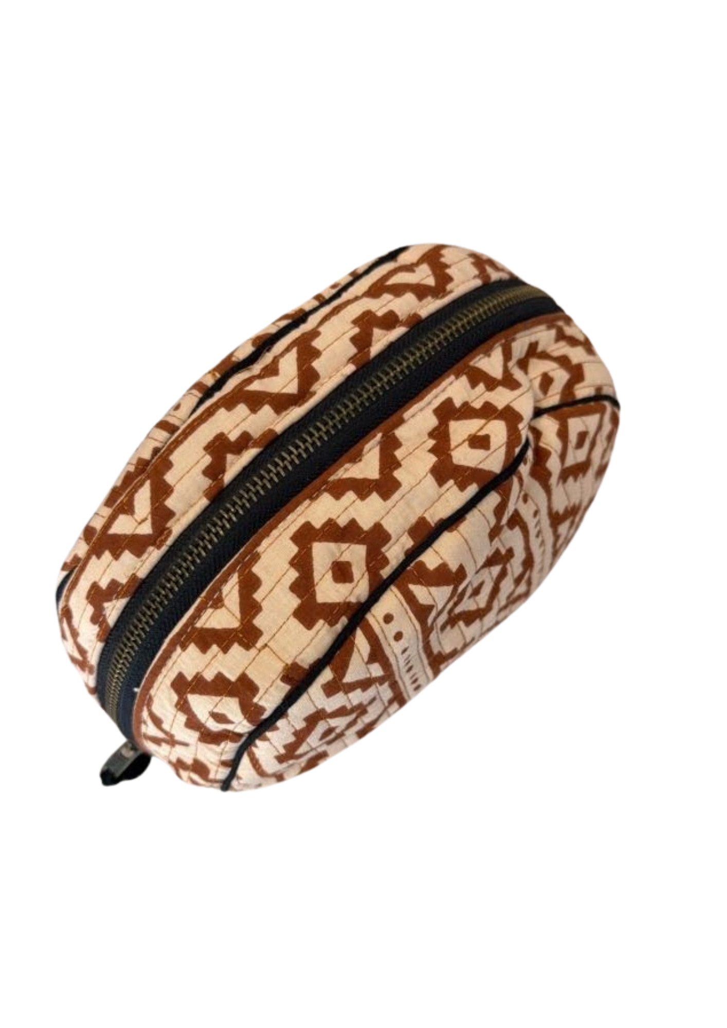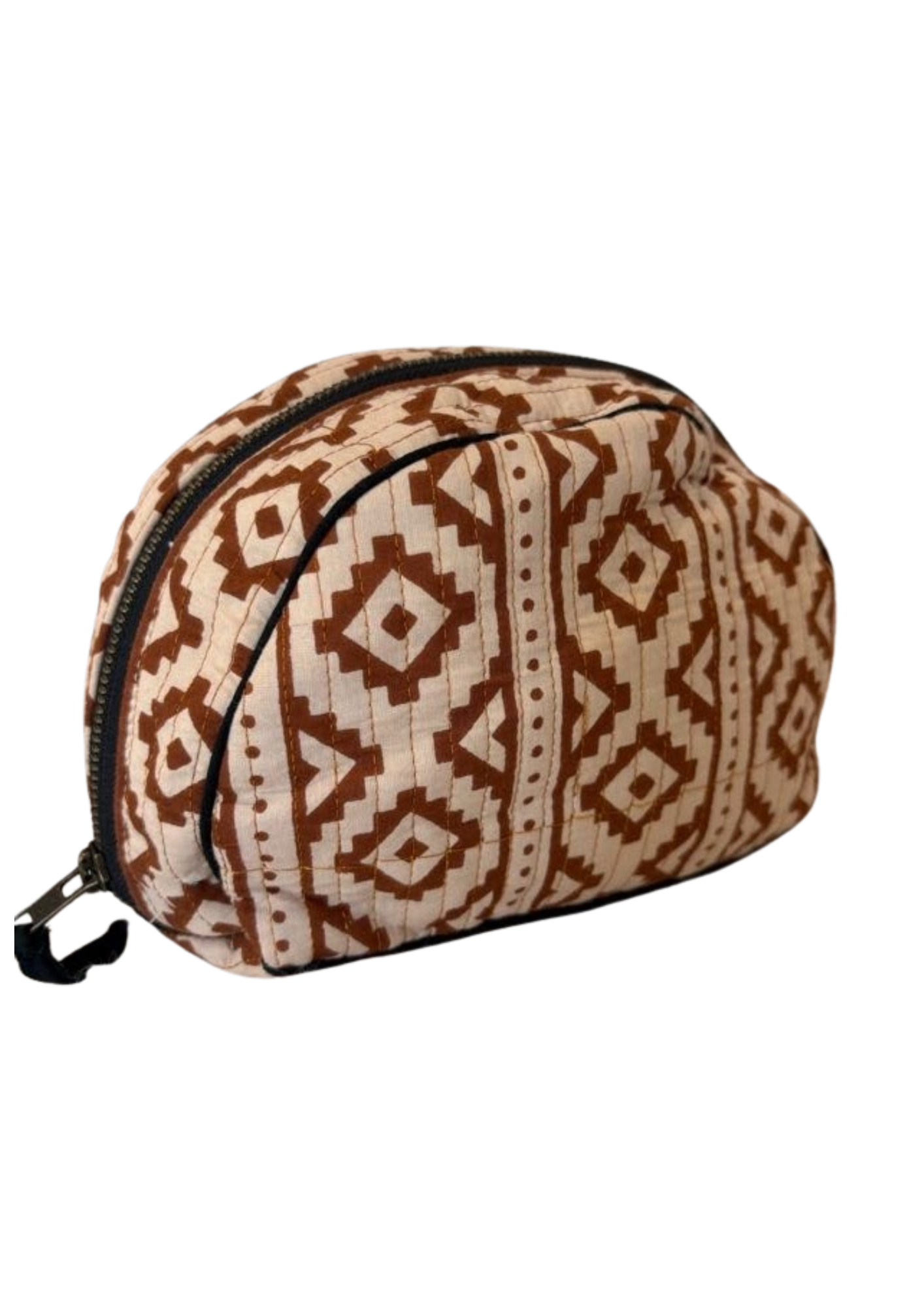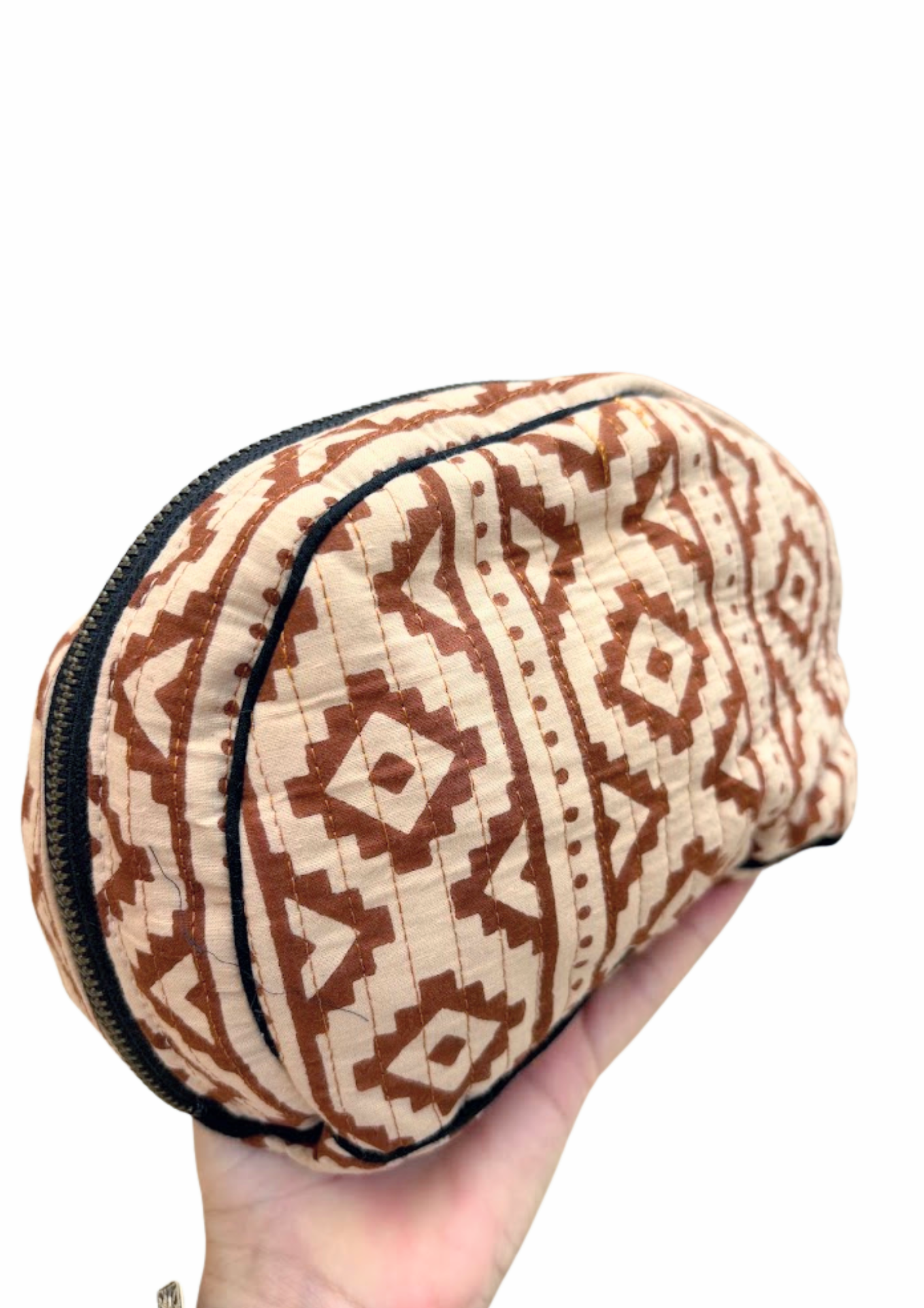- תיק קוסמטי מעוגל בגודל בינוני, עשוי כותנה בעבודת יד, טכניקת תפירה דומה לקווילט.