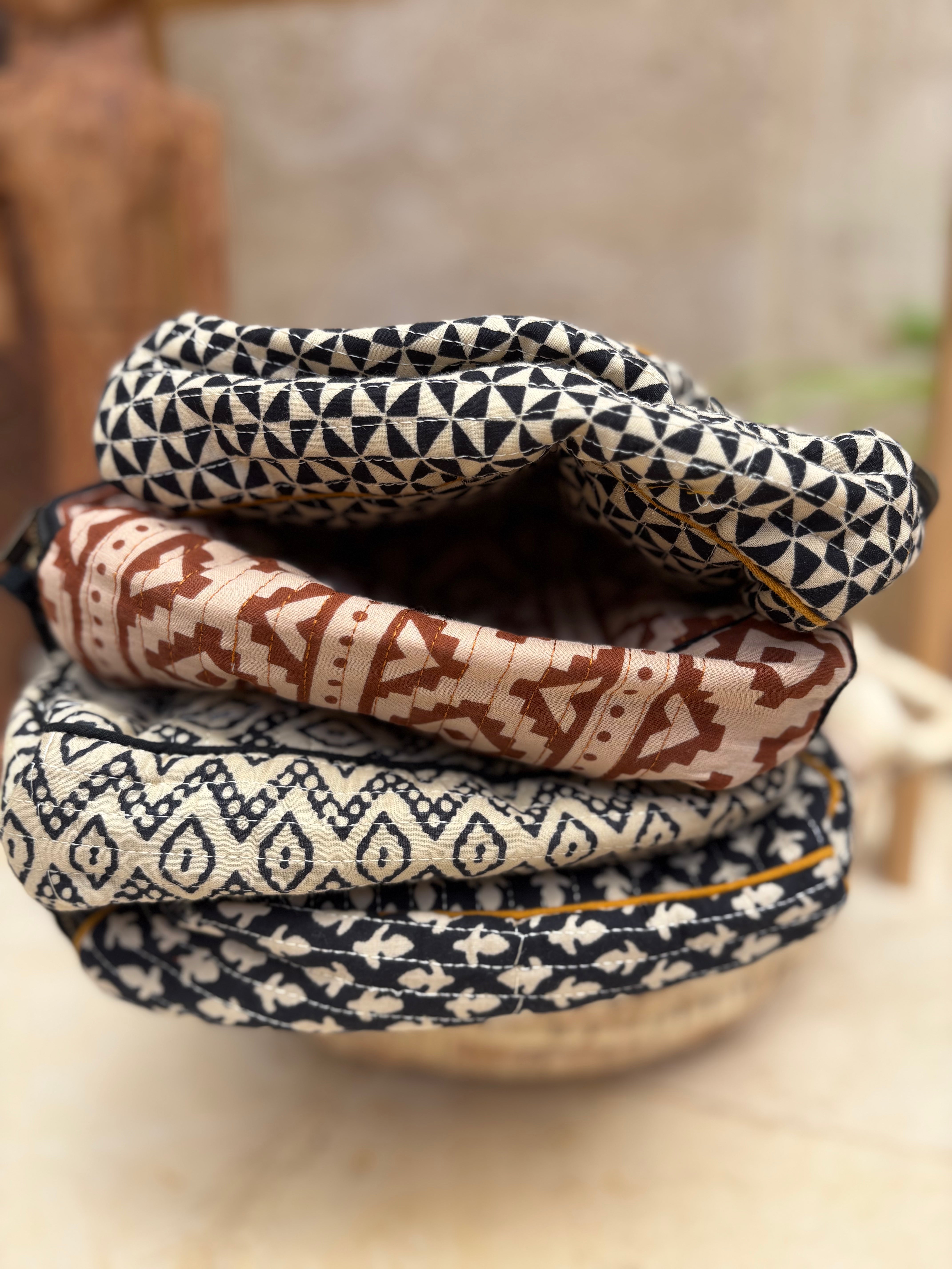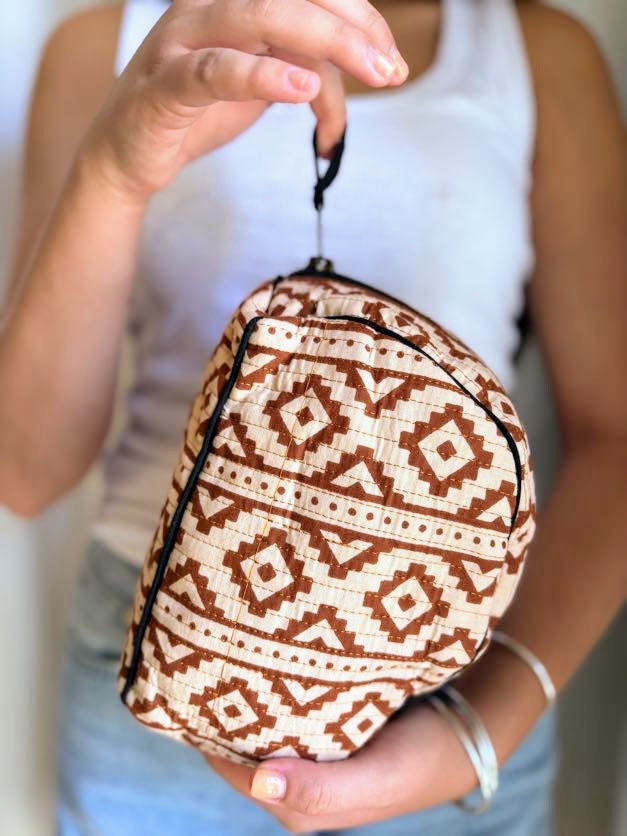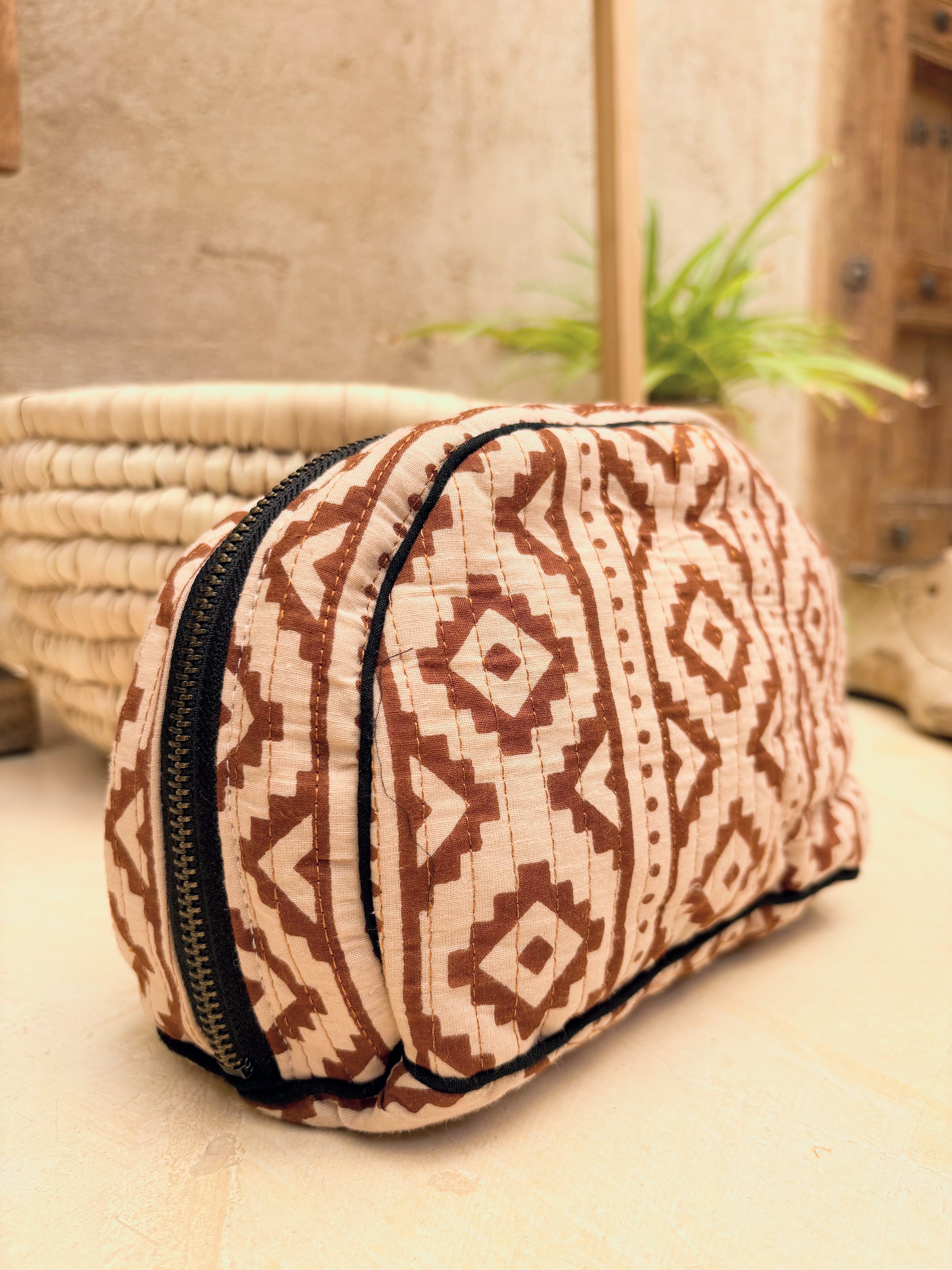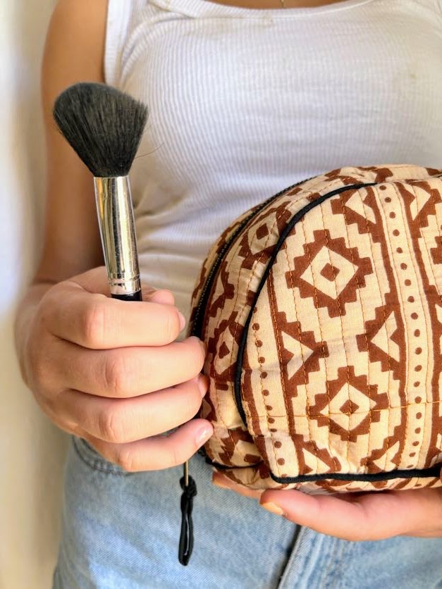 - תיק קוסמטי מעוגל בגודל בינוני, עשוי כותנה בעבודת יד, טכניקת תפירה דומה לקווילט.