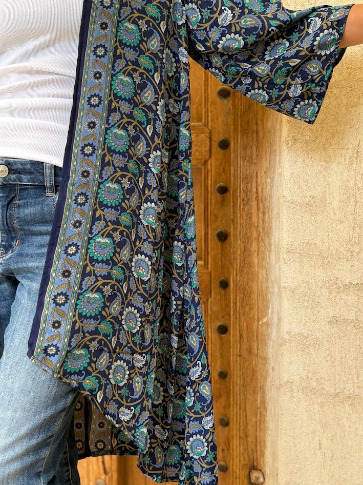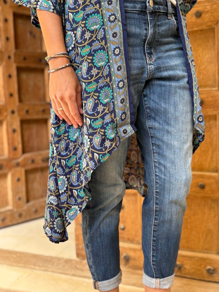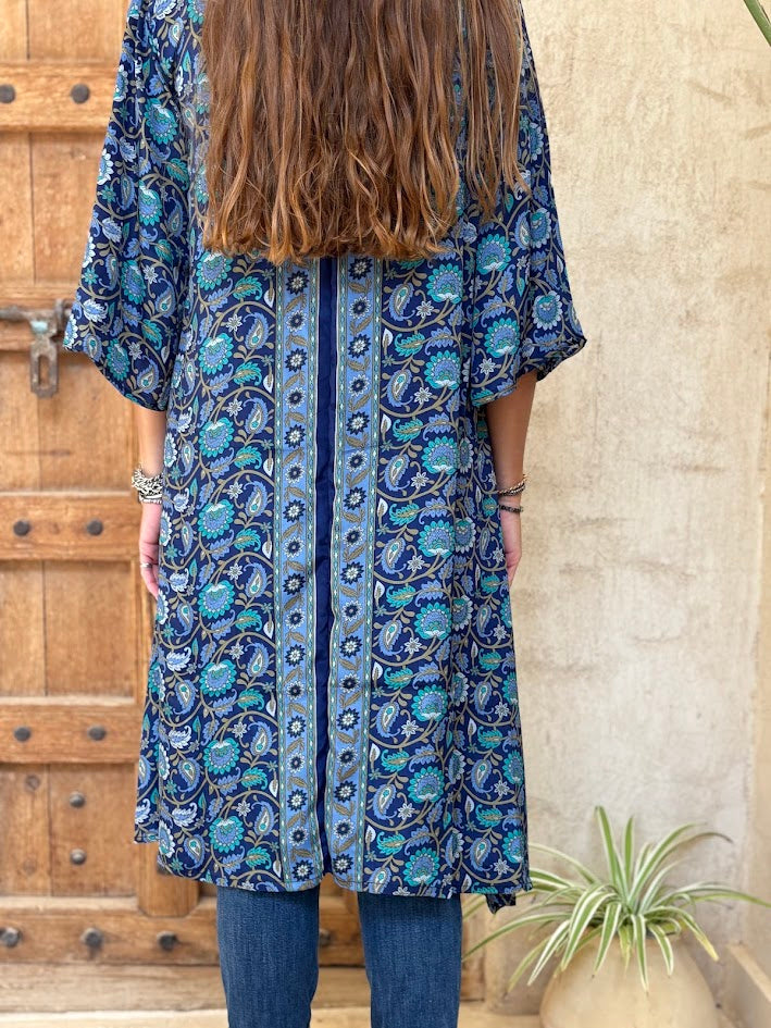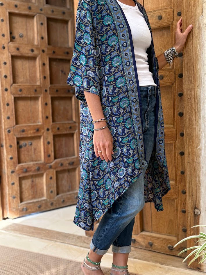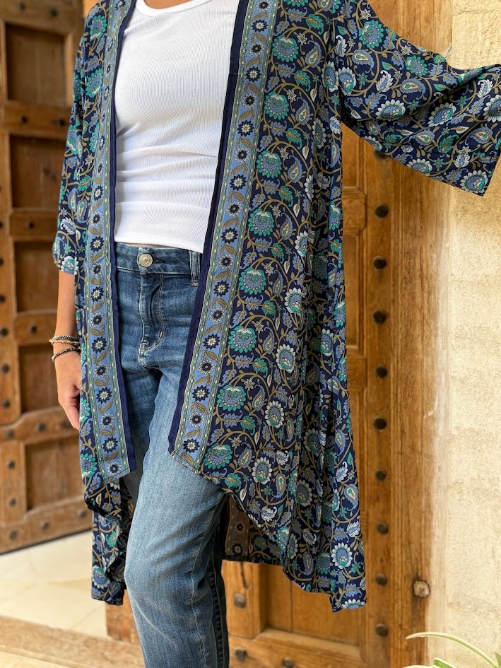 קימנו בגוונים כחולים עמוקים, פריט לבוש שגורף מחמאות מבלי להתאמץ. מתאים כפריט לבוש בכל עונה! בקיץ מעל ג'ינס קצר וגופייה או בגד-ים ובחורף על חולצה דקה-שרוול ארוך, ג'ינס ומגפון או סניקרס.
