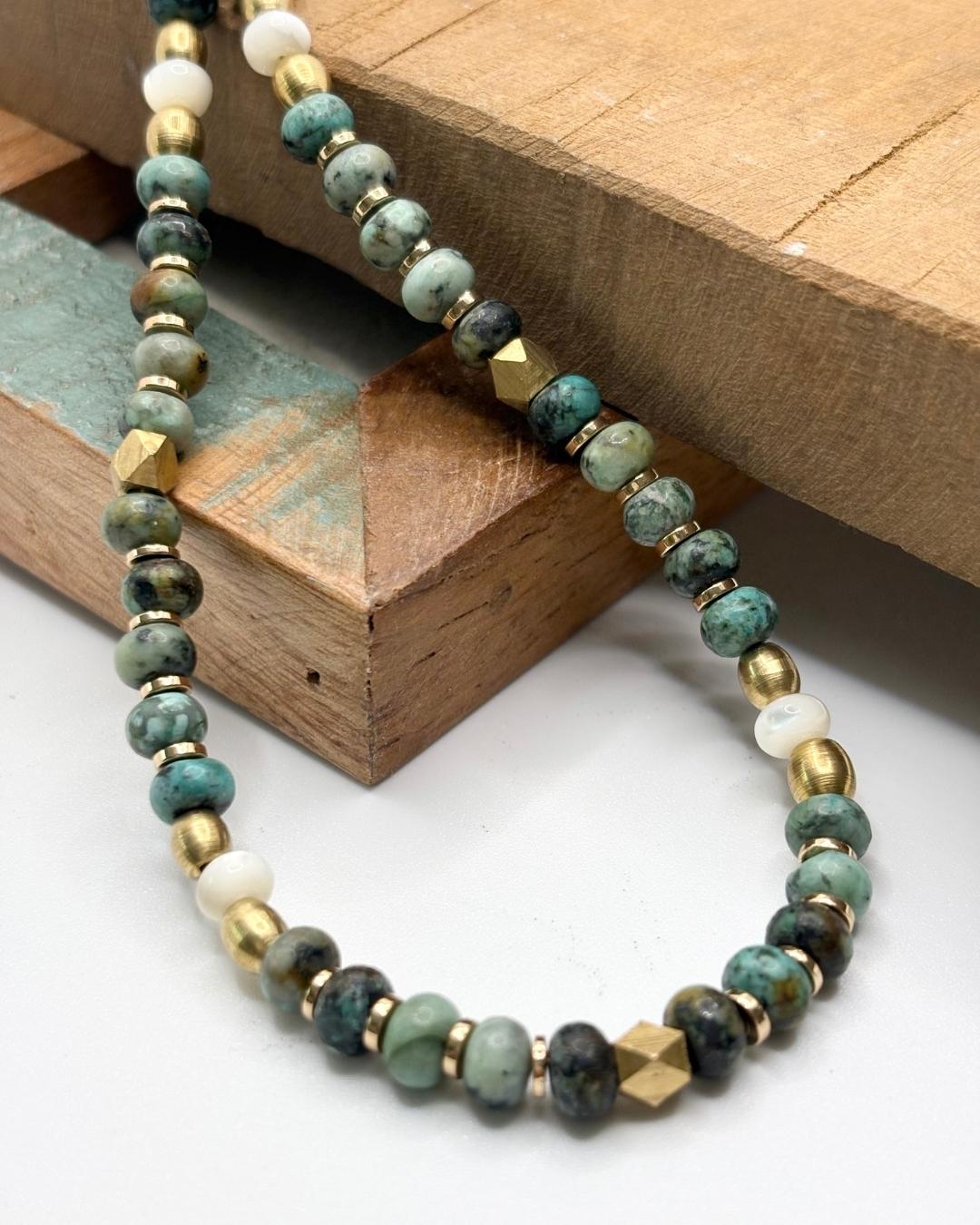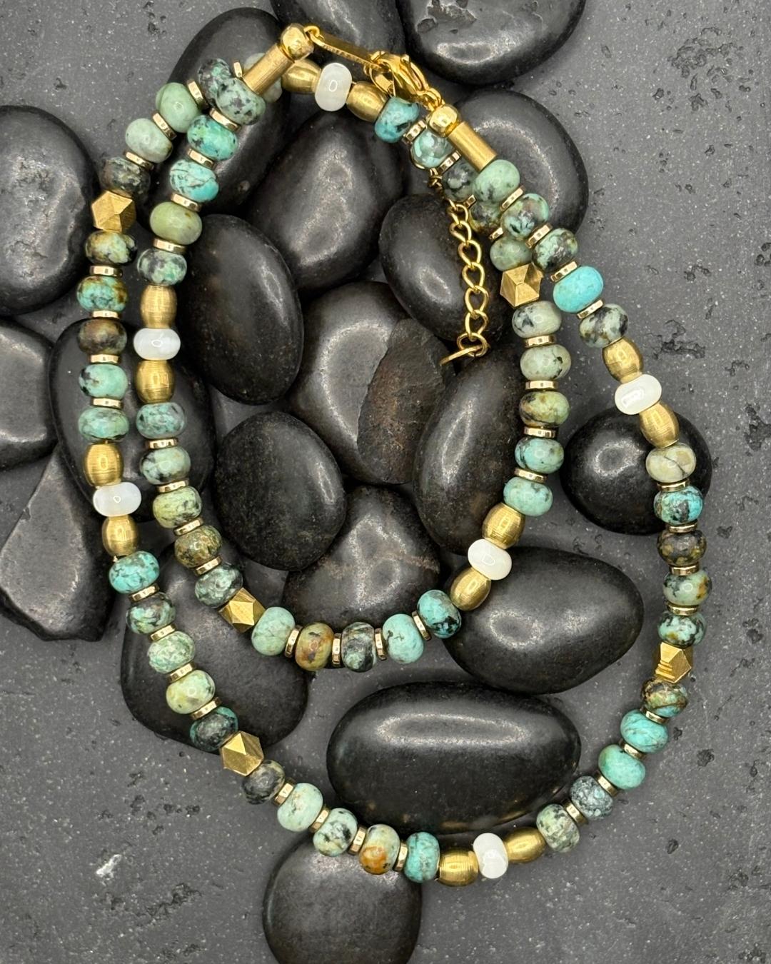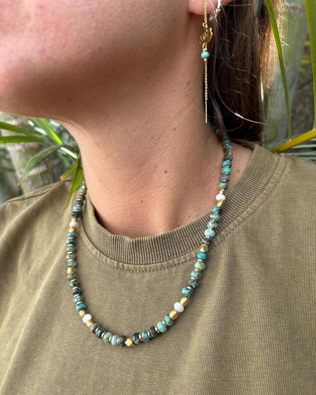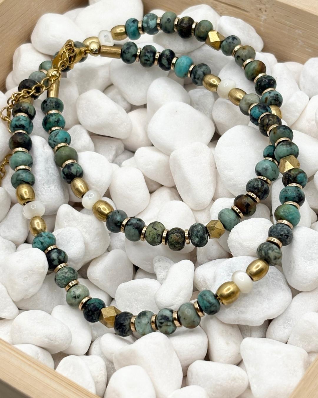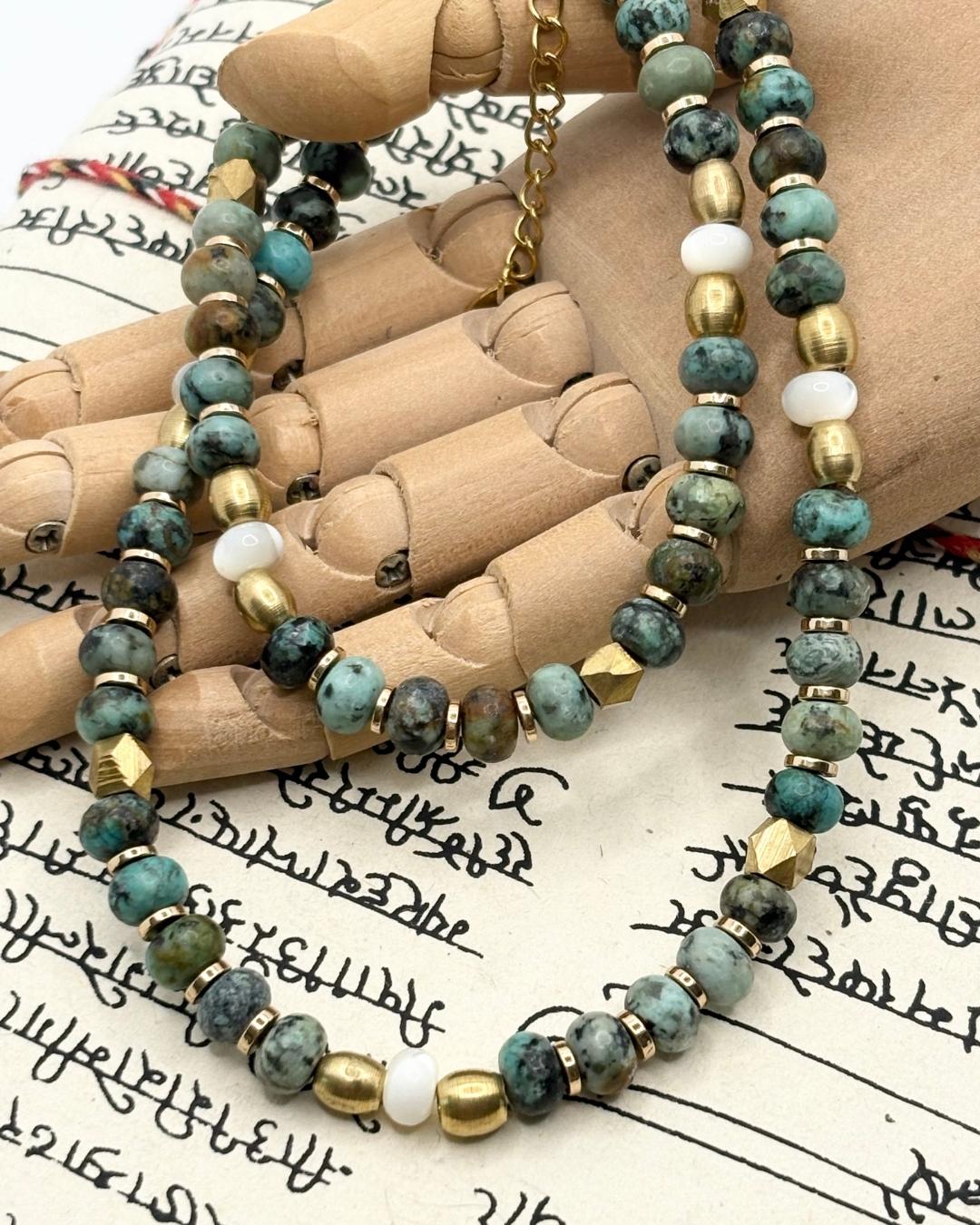 • עשויה מאבני טורקיז אפריקאי בגוון ירוק-חום טבעי, גודל 6 מ"מ