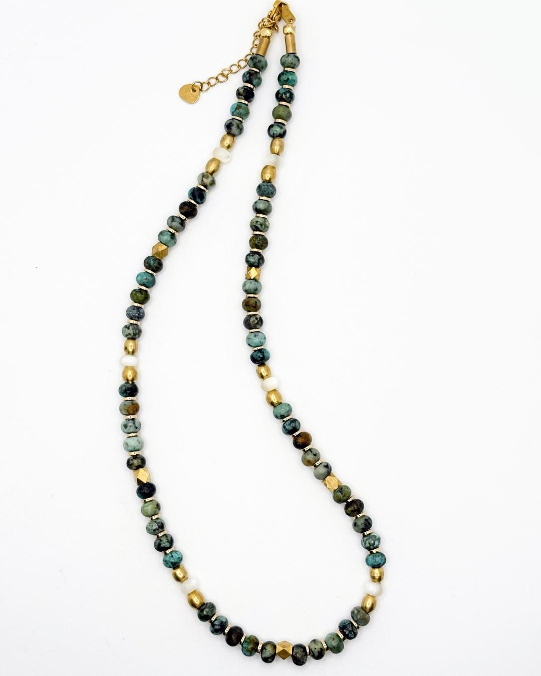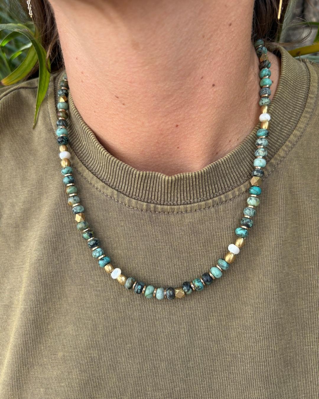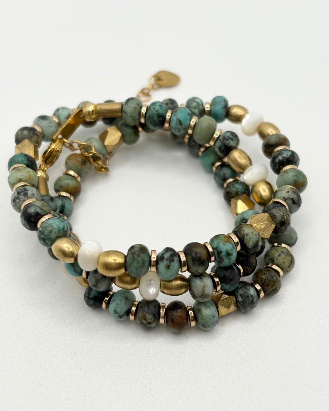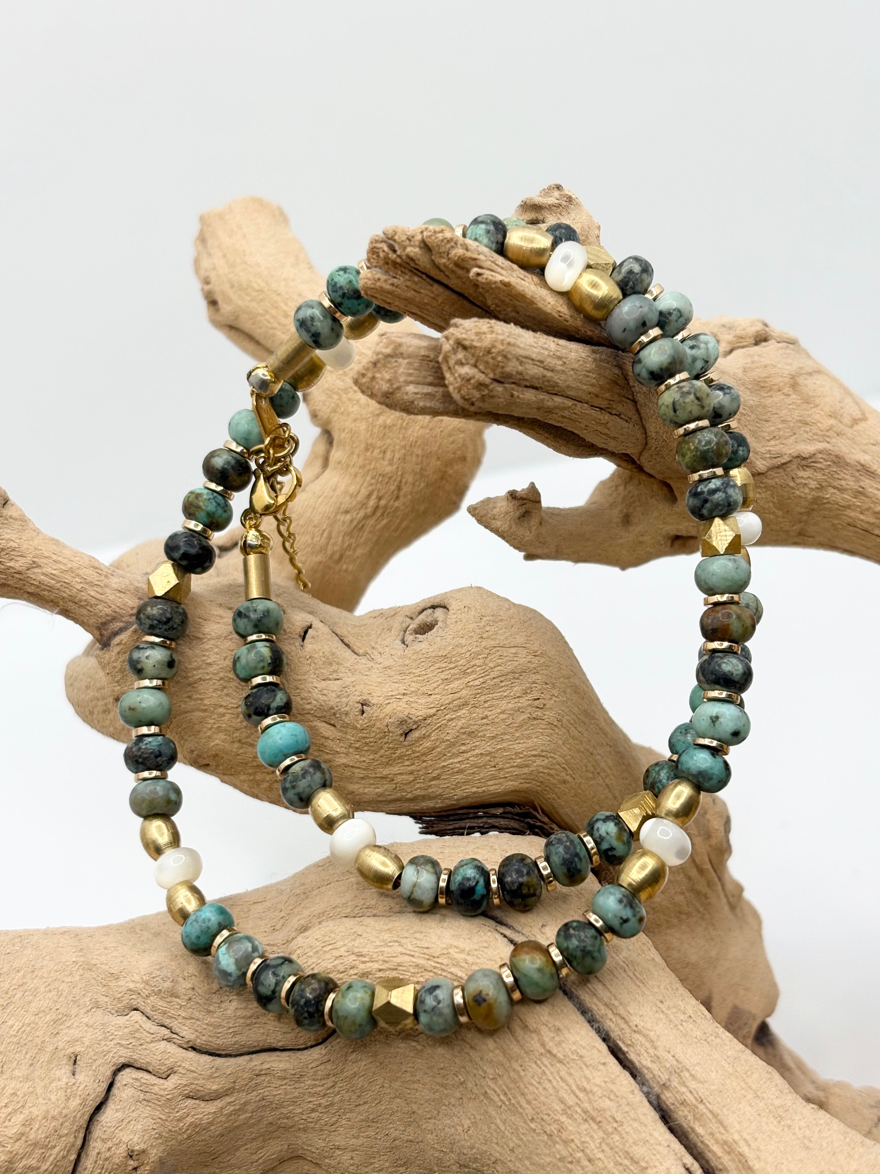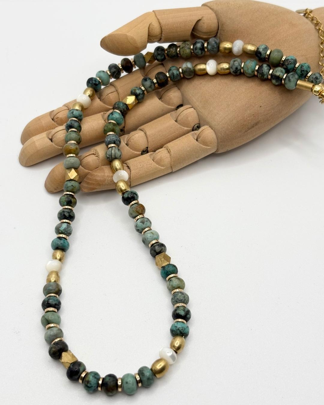 • עשויה מאבני טורקיז אפריקאי בגוון ירוק-חום טבעי, גודל 6 מ"מ