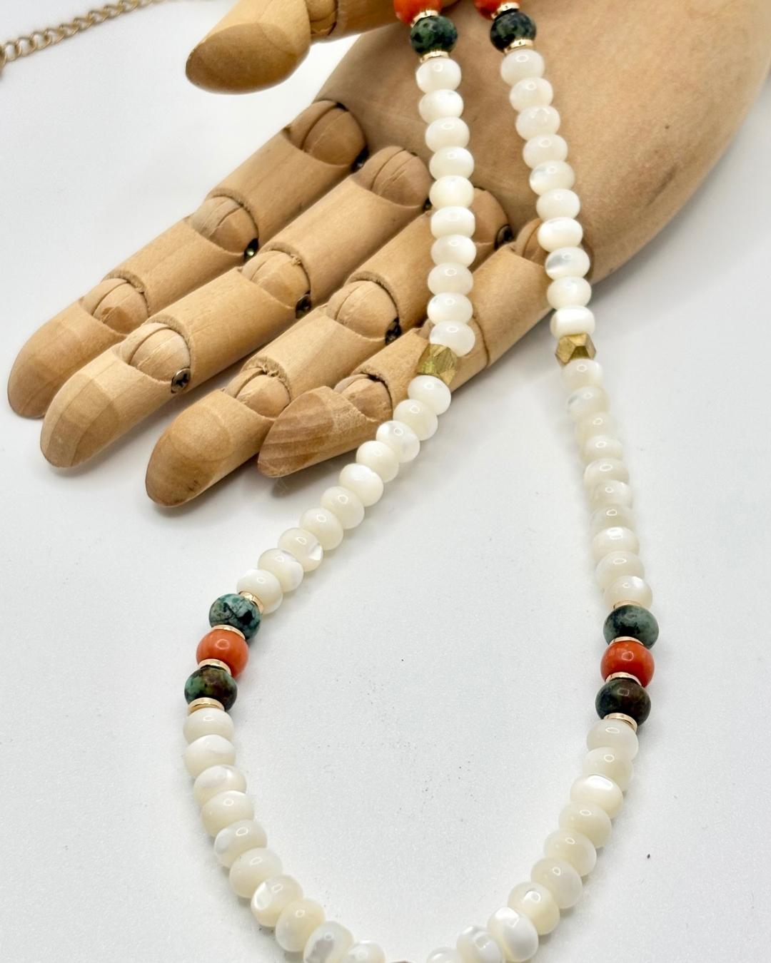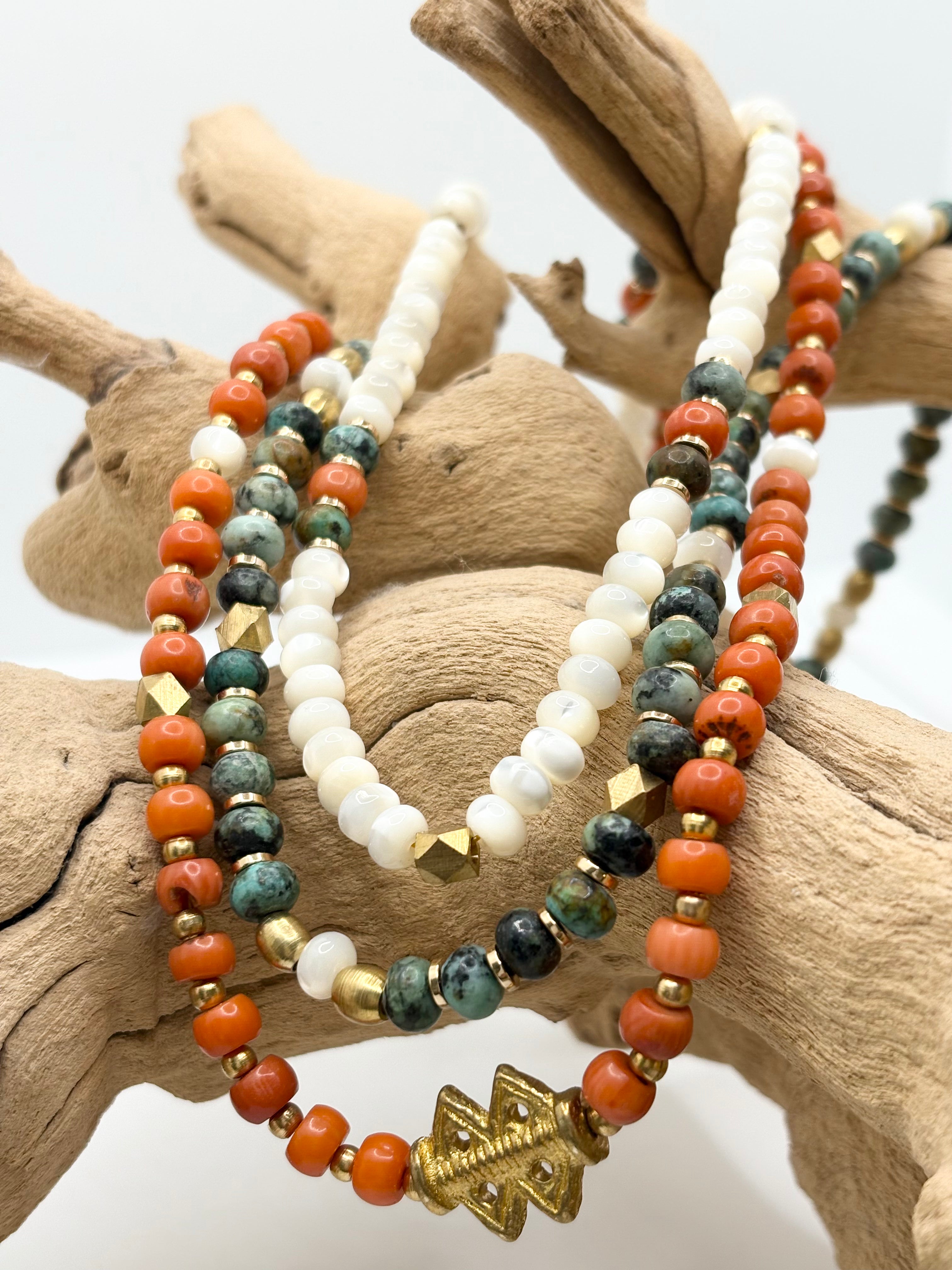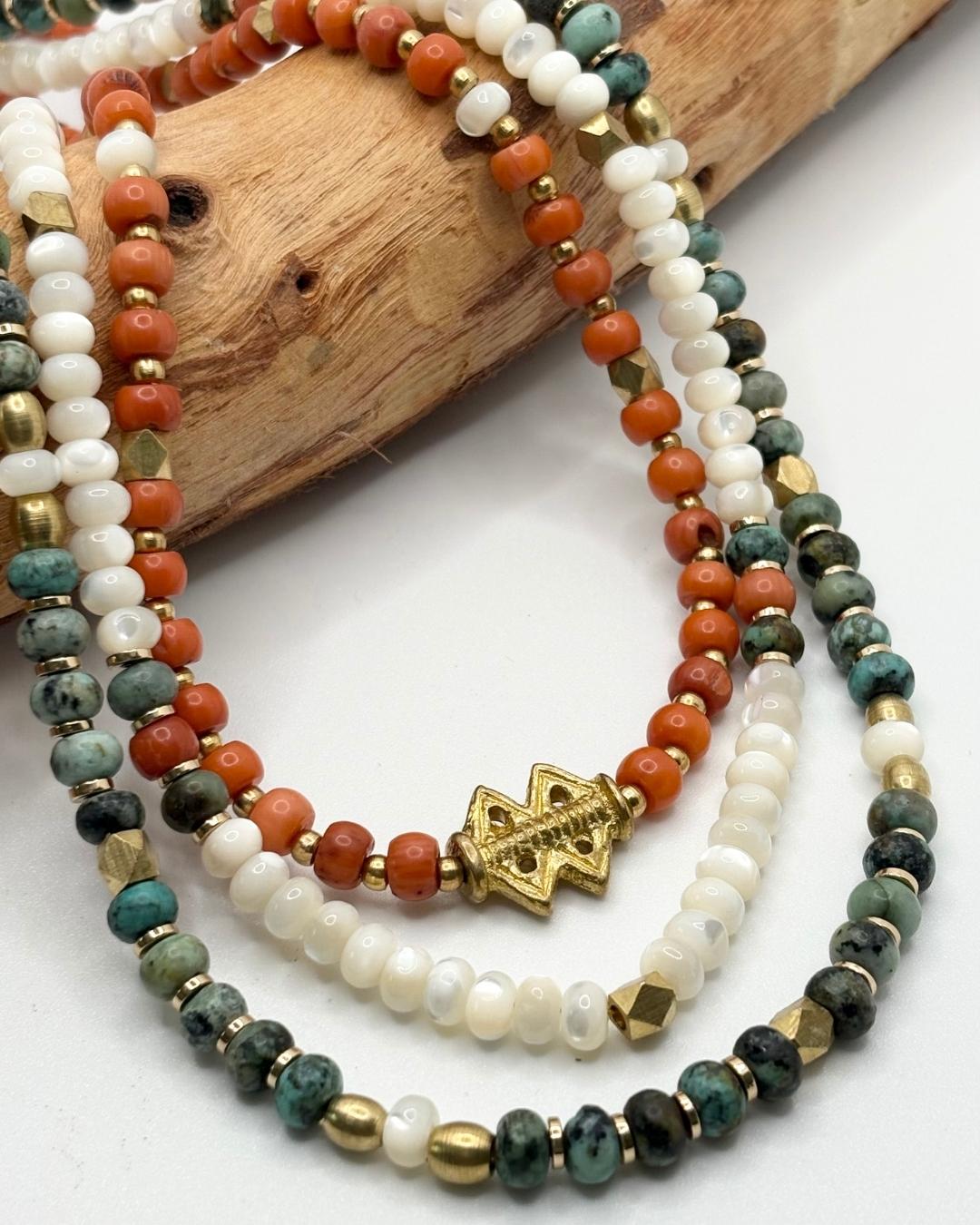 • משולבת עם נגיעות של קורל כתום/אדום וטורקיז אפריקאי בגווני ירוק/חום